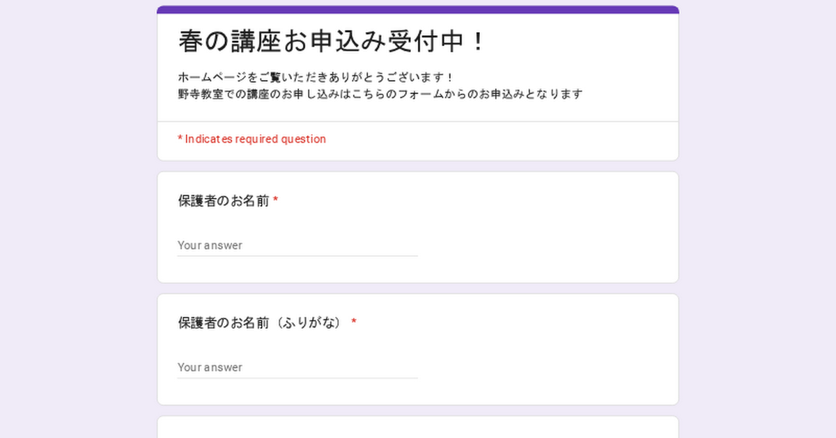 ホームページをご覧いただきありがとうございます!野寺教室での講座のお申し込みはこちらのフォームからのお申込みとなります